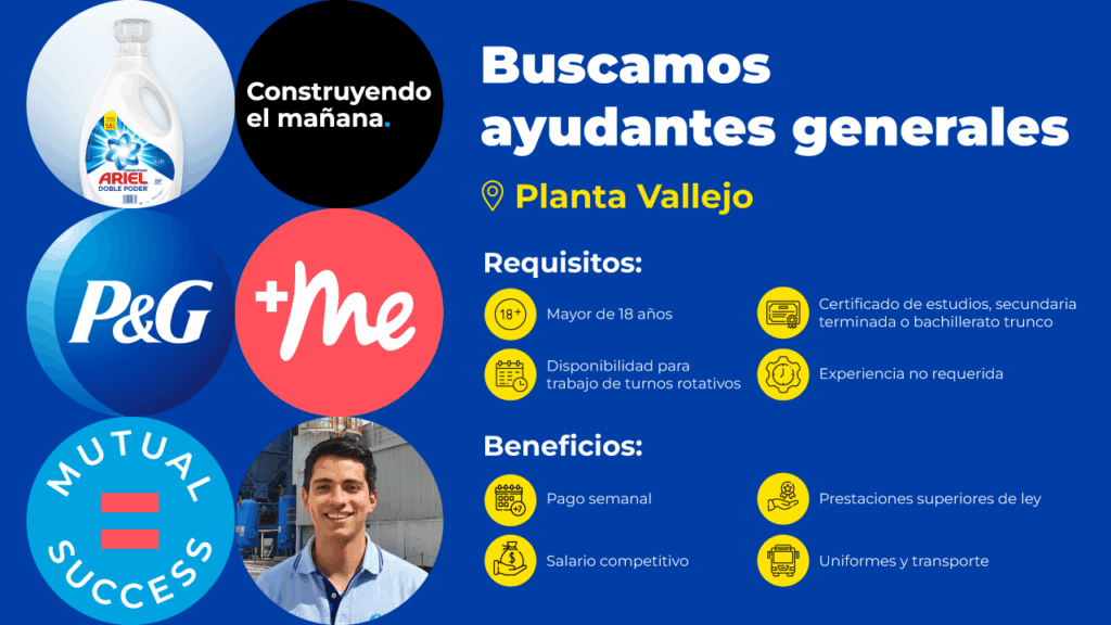 P&G ofrece un paquete competitivo de beneficios que constituye una ventaja significativa para sus colaboradores. Los empleados disfrutan de seguro médico privado, plan de pensiones, bonos por desempeño y programas de desarrollo profesional continuo. La empresa también proporciona flexibilidad horaria en muchos puestos, oportunidades de teletrabajo y políticas de inclusión y diversidad. Los beneficios adicionales incluyen descuentos en productos de la compañía, actividades de bienestar y programas de calidad de vida.